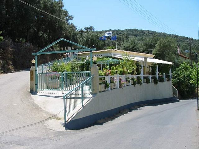 Etwa 800m vom Strand enfernt, auf der Straße zum Meer liegt die Aspros Taverne. Auch hier werden typisch korfiotische Gerichte angeboten. Am besten sitzt es sich auf der großen Panorama-Dachterrasse mit einem tollen Ausblick.